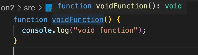 voidFunction 함수의 이름에 마우스 커서를 올려 타입스크립트가 추론한 이 함수의 타입을 확인합니다.