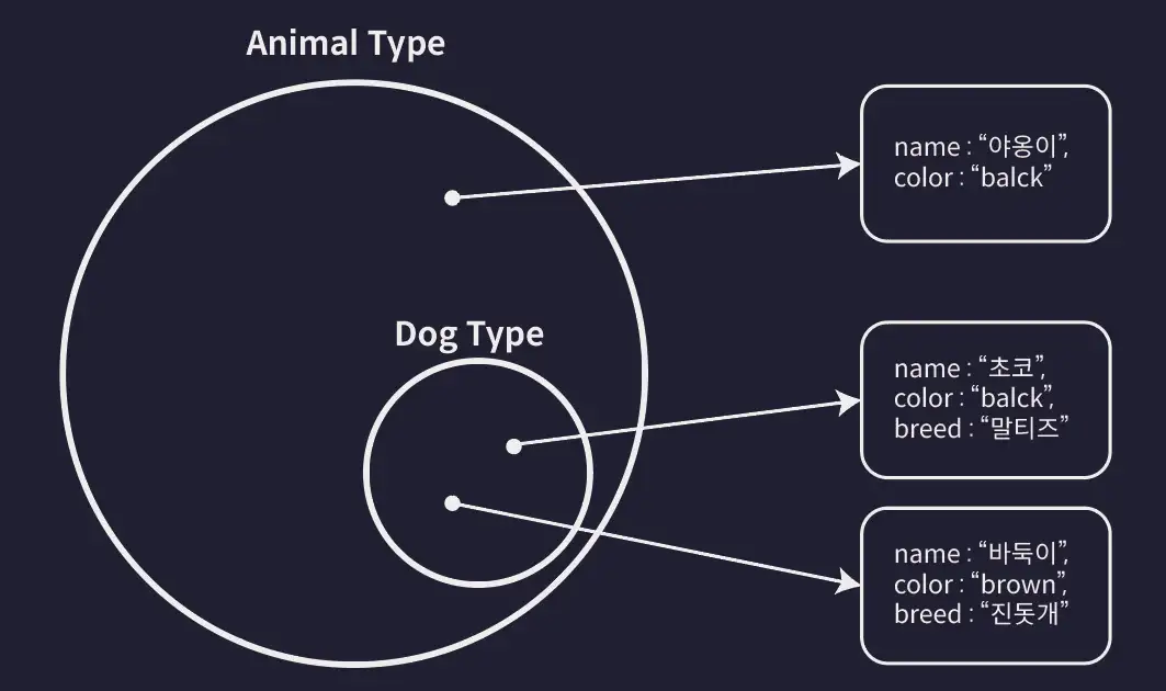 Dog 타입에 해당하는 값들은 Animal 타입에 해당하는 값들이 갖는 프로퍼티를 모두 갖습니다. 따라서 Dog 타입의 모든 값을 Animal 타입의 값이라고 해도 무방합니다. 마치 “모든 개는 동물이다”라고 표현하는 것과 같으며 이는 말이 됩니다.