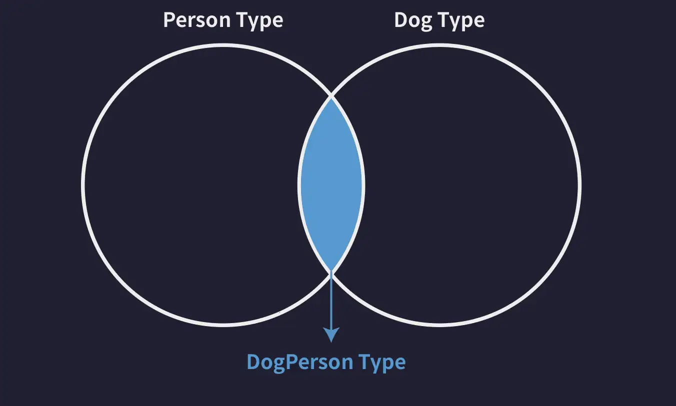 변수 dogPerson은 name, loc, breed 프로퍼티를 갖습니다. dogPerson은 Dog 타입의 값으로 볼 수 있습니다. name, breed 프로퍼티를 갖기 때문입니다. 동시에 Person 타입의 값으로도 볼 수 있습니다. name, loc 프로퍼티를 갖기 때문입니다. 결국 dogPerson은 Dog, Person 타입에 모두 속합니다. 두 타입의 교집합으로 볼 수 있습니다.