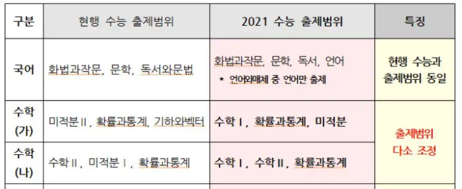 아래의 사진은 교육청에서 발표한 ‘2021년도 수능 출제범위’ 에요