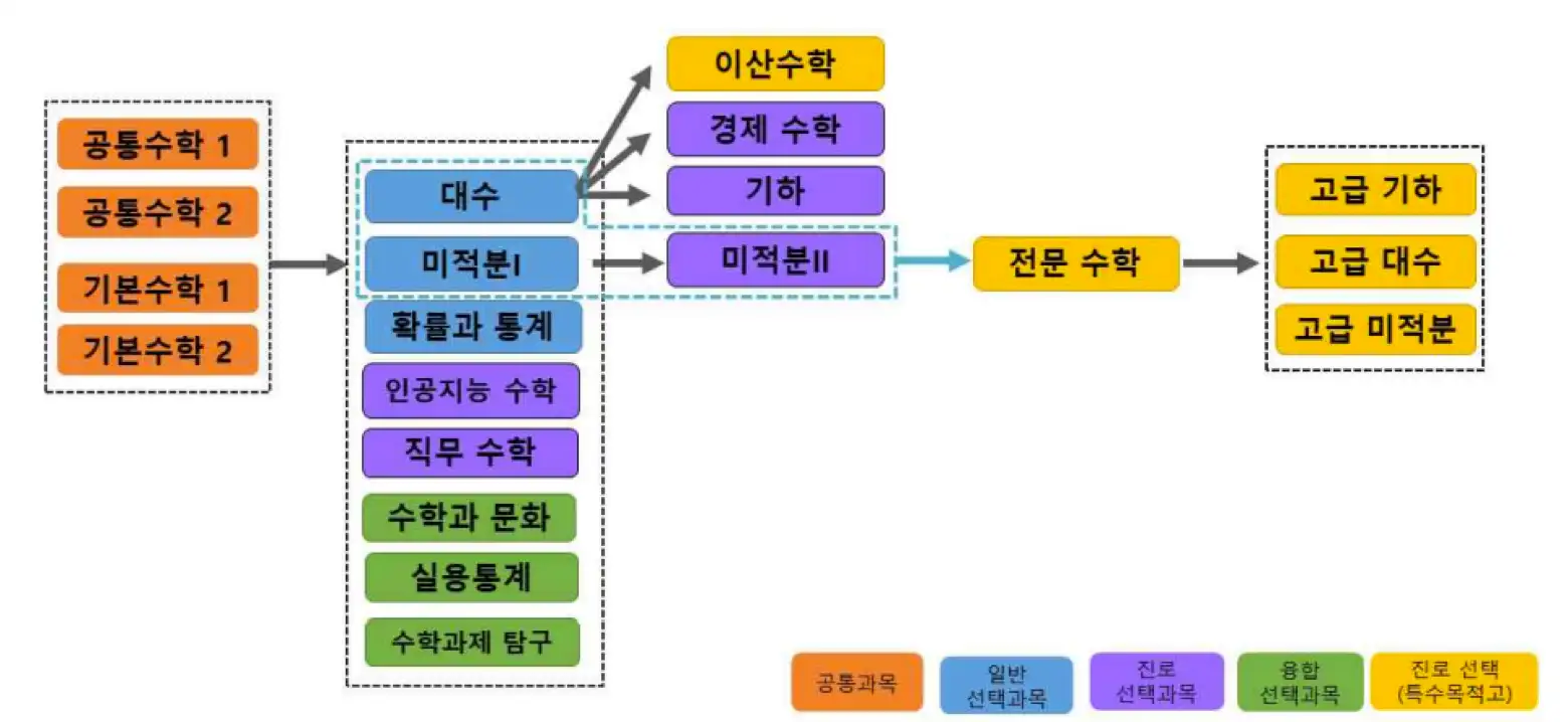 위 사진은 고등 수학 과정의 커리큘럼인데요 공통수학 1,2 그리고 기본수학 1,2를 배우면 대수를 배우고, 미적분 1을 배우고 등등… 이런 식으로 선형적인 학습의 순서가 정해져 있었죠