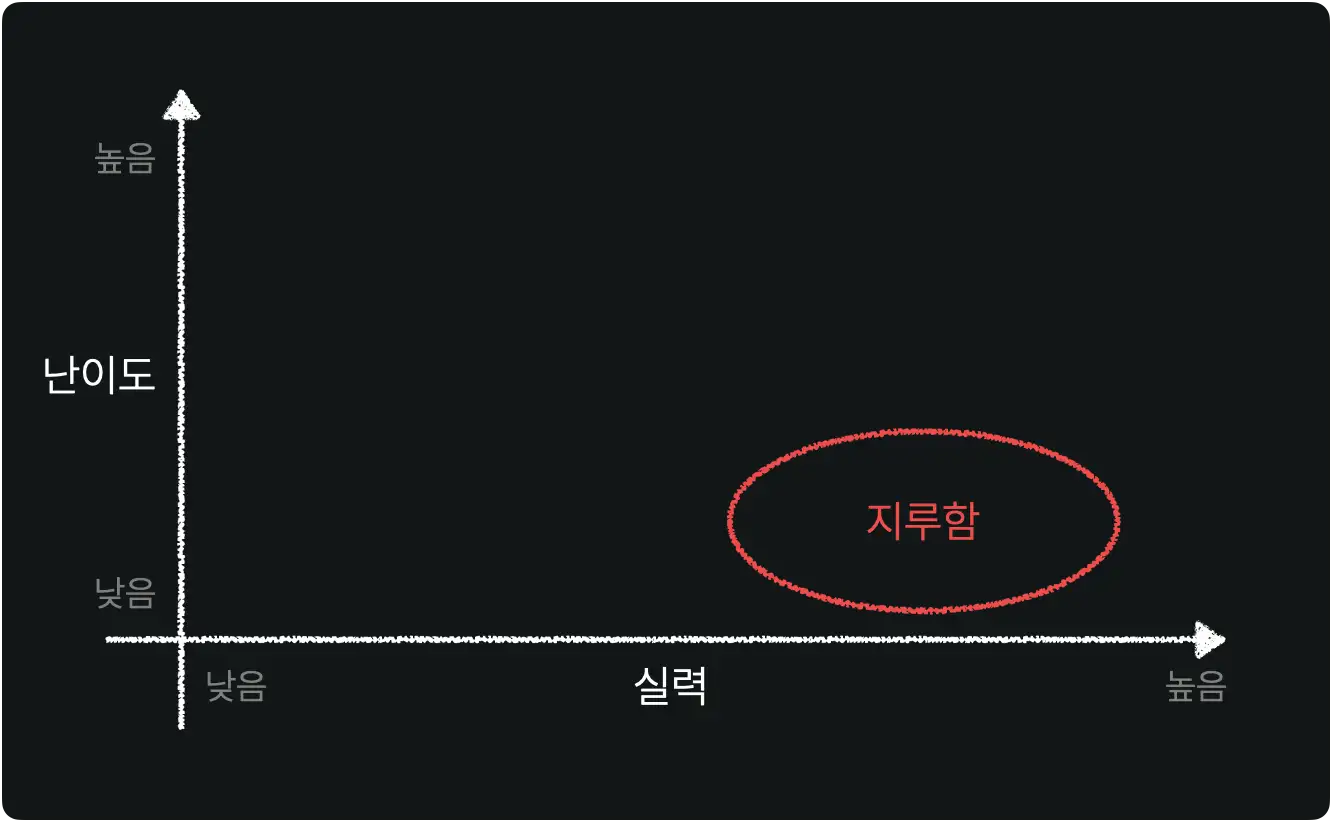 반면 위 그림처럼 나의 실력은 높지만 난이도는 낮은 그런 과제를 마주하게 되면 아까와는 반대로 지루함을 느끼게 된다고 합니다.