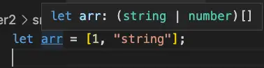 변수 arr에는 배열이 저장되어 있습니다. 그리고 이 배열에는 number 타입과 string 타입 요소가 담겨 있습니다.이럴 경우 타입스크립트는 arr의 타입을 다음과 같이 추론합니다.