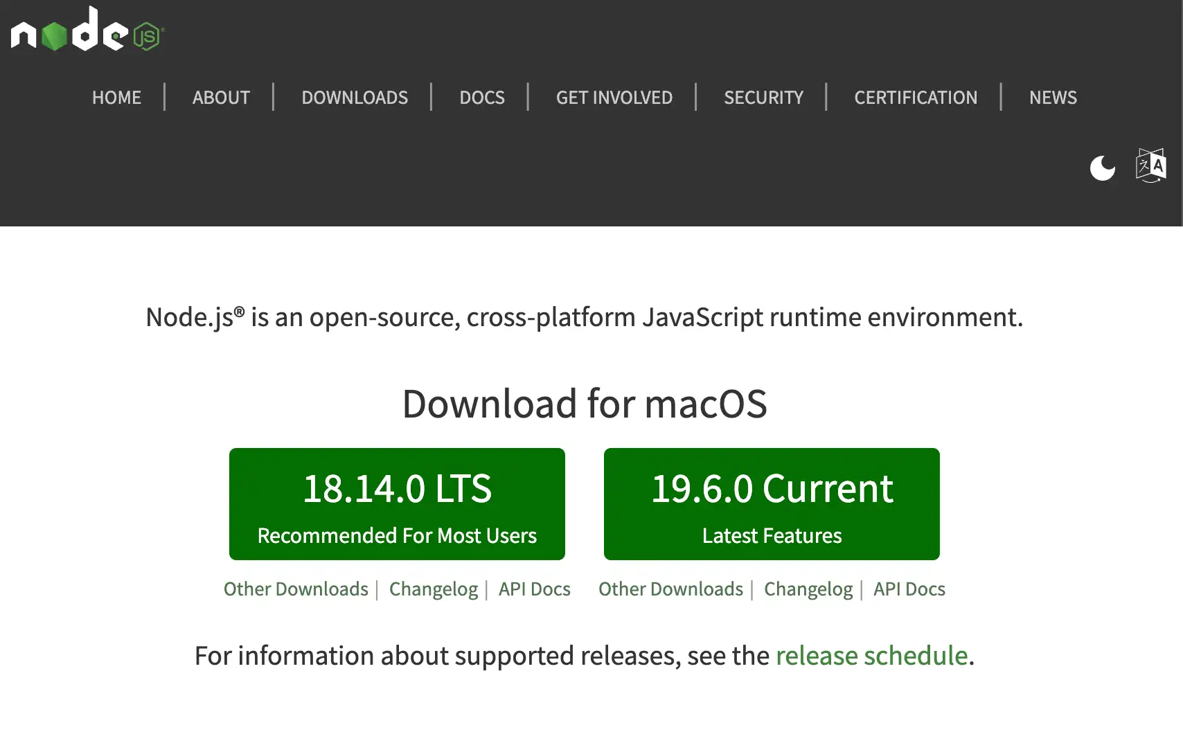 LTS(Long Term Support) 버전이란 오랜 기간 유지보수되는 버전으로 프로덕션 개발에 가장 적합한 안정적인 버전 입니다. 보통 Node.js는 짝수 버전이 LTS 버전 홀수 버전은 실험적인 버전으로 개발됩니다. 이 글을 작성하는 2022년 2월 기준으로 Node.js의 LTS 버전은 18 버전입니다.아래 링크에서 Node.js 버전의 현황을 자세히 살펴볼 수 있습니다.