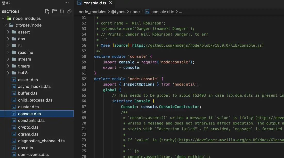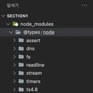 폴더를 열어보면 Node.js가 기본적으로 제공하는 기능(내장 함수 등)들에 대한 타입이 선언되어 있는 여러개의 폴더와 파일들이 존재합니다.