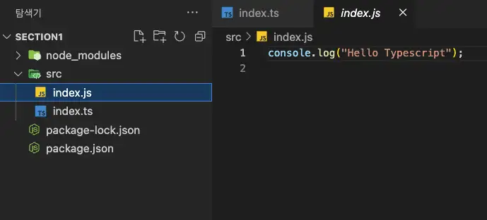 tsc 파일명 은 특정 파일을 컴파일 하도록 타입스크립트 컴파일러에게 지시하는 명령어입니다. 위 명령어를 입력하면 src/index.ts 파일을 타입스크립트 컴파일러가 컴파일 합니다.