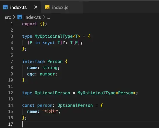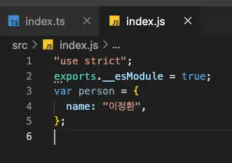 컴파일이 완료되면 자바스크립트 파일 src/index.js 이 생성됩니다. 파일을 열어 컴파일 된 자바스크립트 코드를 확인합니다.