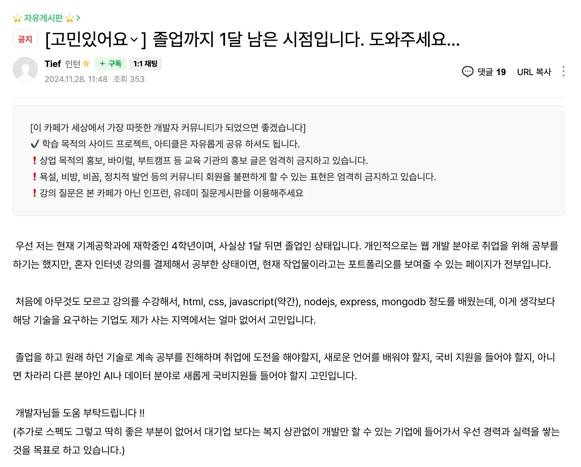 11월 28일 카페에 이런 게시글이 하나 올라왔습니다.