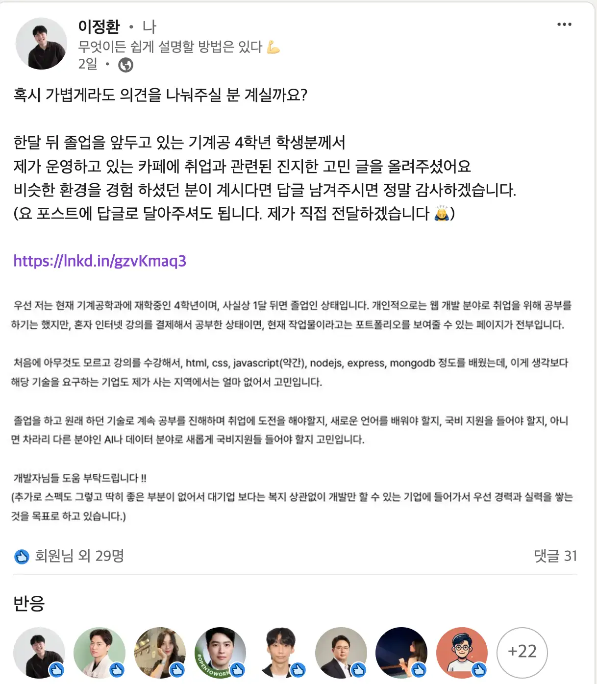 내용을 요약하면 졸업을 한달 앞두고 있는 기계공학과 학생분께서